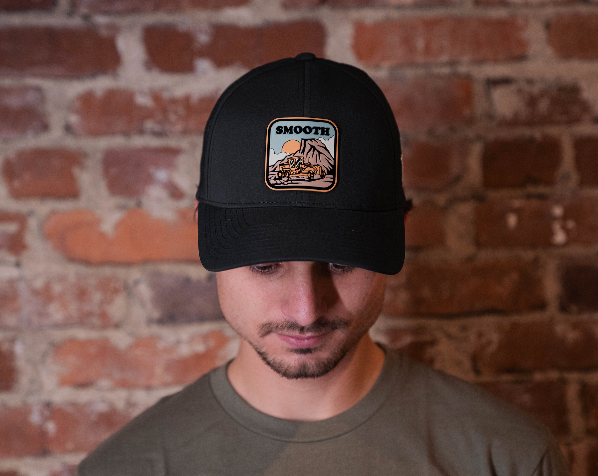 The Branded Bills 500 Series Curved Performance hat w/ a PVC "Smooth" patch. Color—black.